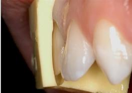 Nous prenons tout d’abord une clé en silicone du secteur antérieur maxillaire qui nous servira à contrôler le fraisage.