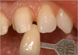 Lorsque tout est prêt en bouche, l’intrados de la facette est enduit d’une couche d’adhésif légèrement séché et non polymérisé puis de la colle composite (Choice™ de Bisico) ; l’ensemble est mis en place sur la dent préparée.