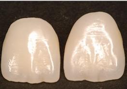 Dans l’attente du collage des deux éléments terminés, deux facettes provisoires ont été réalisées au laboratoire à partir du duplicata de l’empreinte d’étude qui a été préparée sur le plâtre par le praticien (préparation à minima). Réalisées au laboratoire, les deux pièces provisoires seront rebasées en bouche puis scellées au Dycal™.