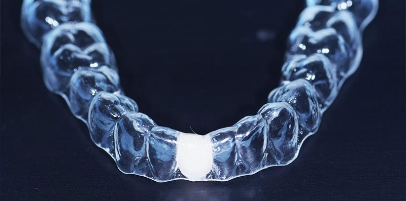 2è étape après la préparation de la dent : une gouttière de contention incluant une dent réalisée en composite, maintiendra le feston gingival.