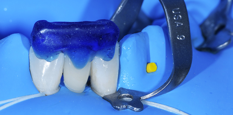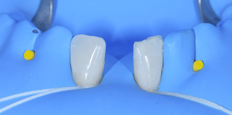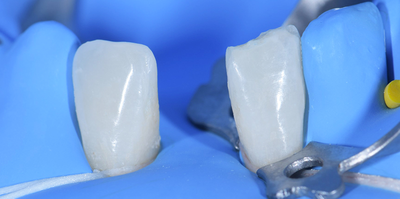 Attention, nous utiliserons le disilicate de lithium, la surface de collage sera d’un minimum de 16mm2. Nous resterons évidemment sur une taille à minima, qui nous permettra de coller sur de l’émail pour la meilleure adhésion possible.