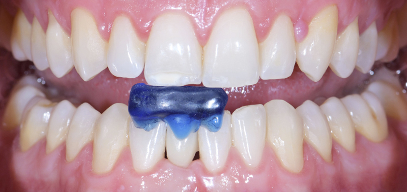 2è étape après la préparation de la dent : une gouttière de contention incluant une dent réalisée en composite, maintiendra le feston gingival.