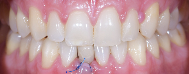 Le jour de l’extraction, nous utilisons ici la dent de lait en tant que provisoire, avec un remodelage du bord cervical, pour guider la cicatrisation.
