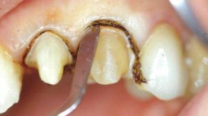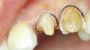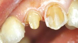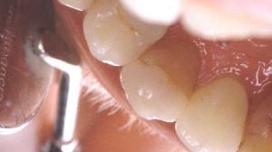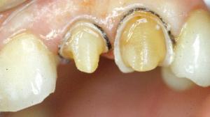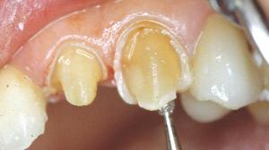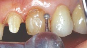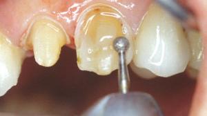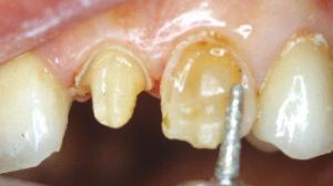 Lors de l’empreinte, le deuxième est déposé, la limite se retrouve alors légèrement sous-gingivale. Le premier est laissé en place pour assurer l’hémostase (cette technique permet d’obtenir une limite sous-gingivale sans toucher la gencive avec la fraise).