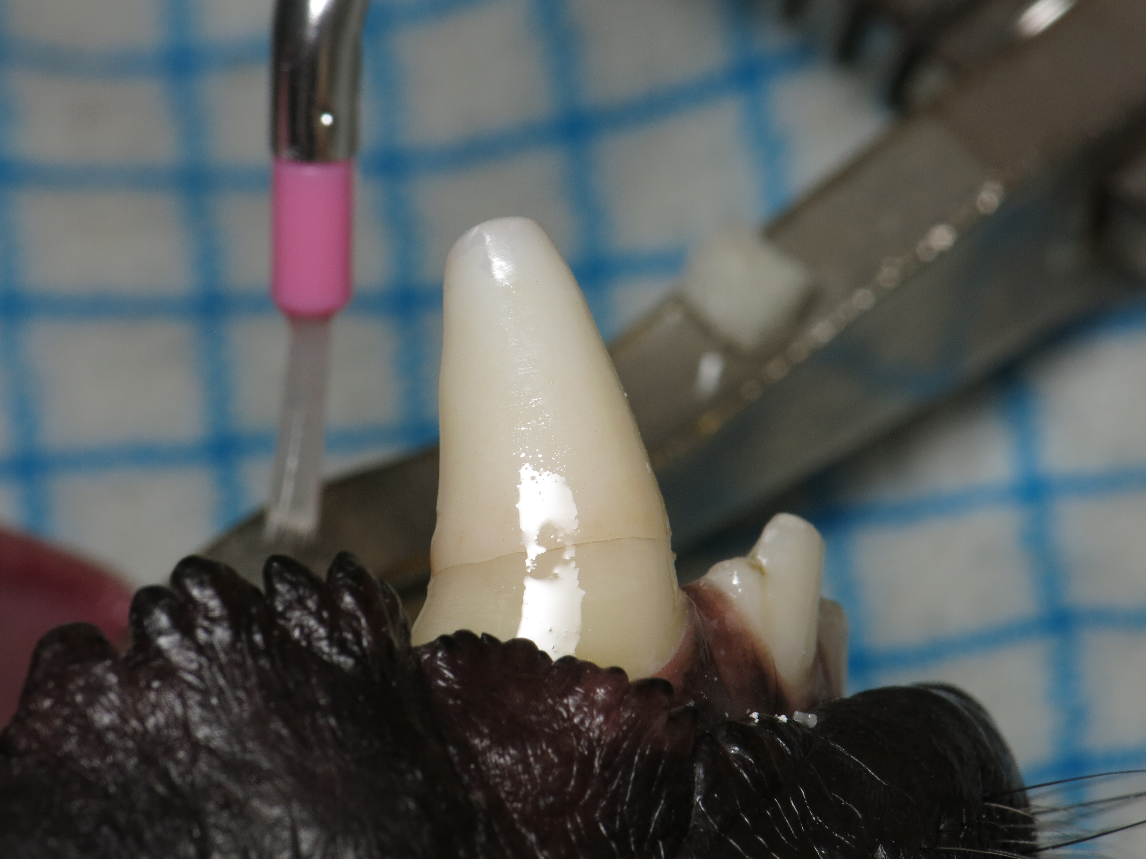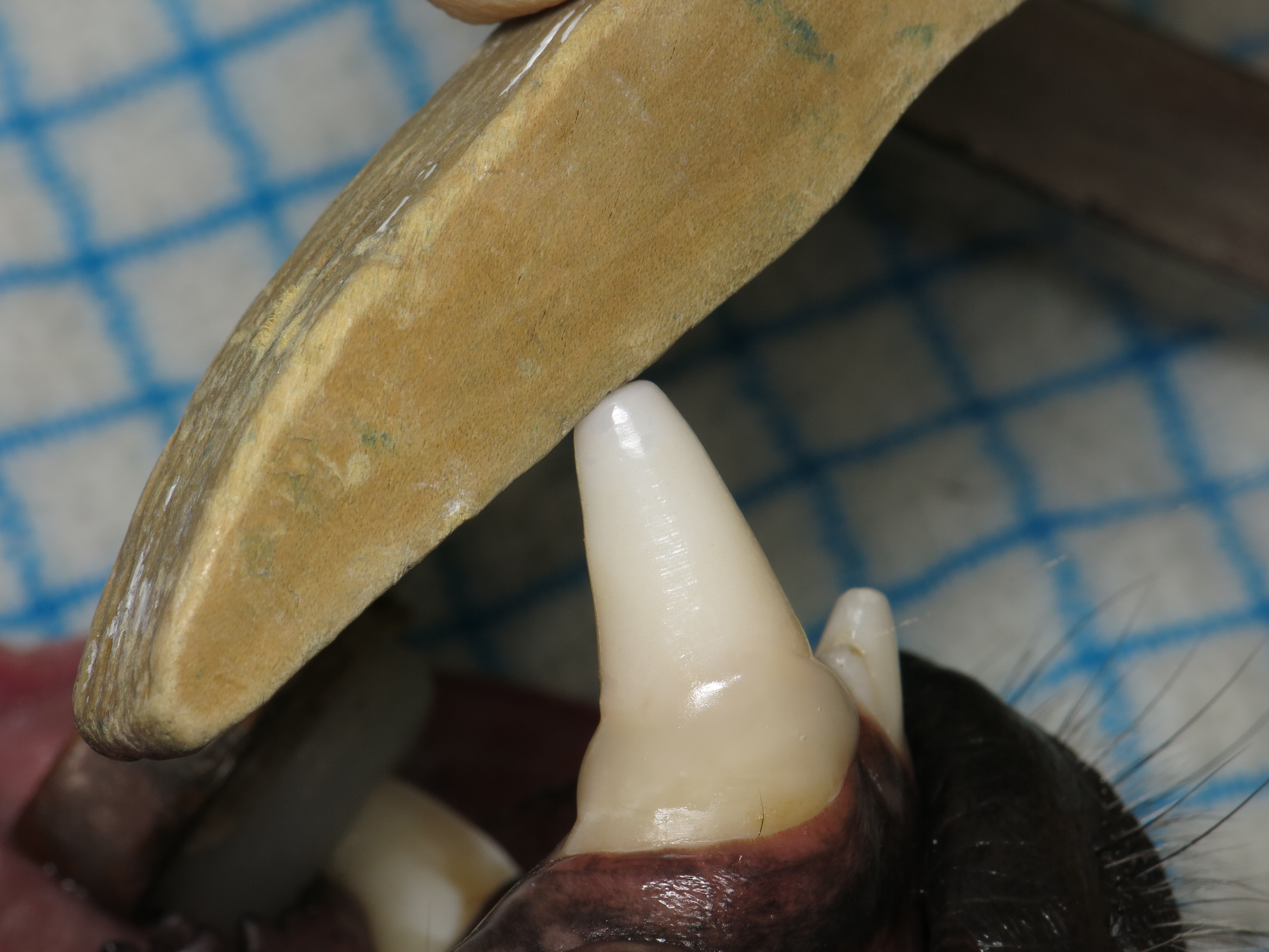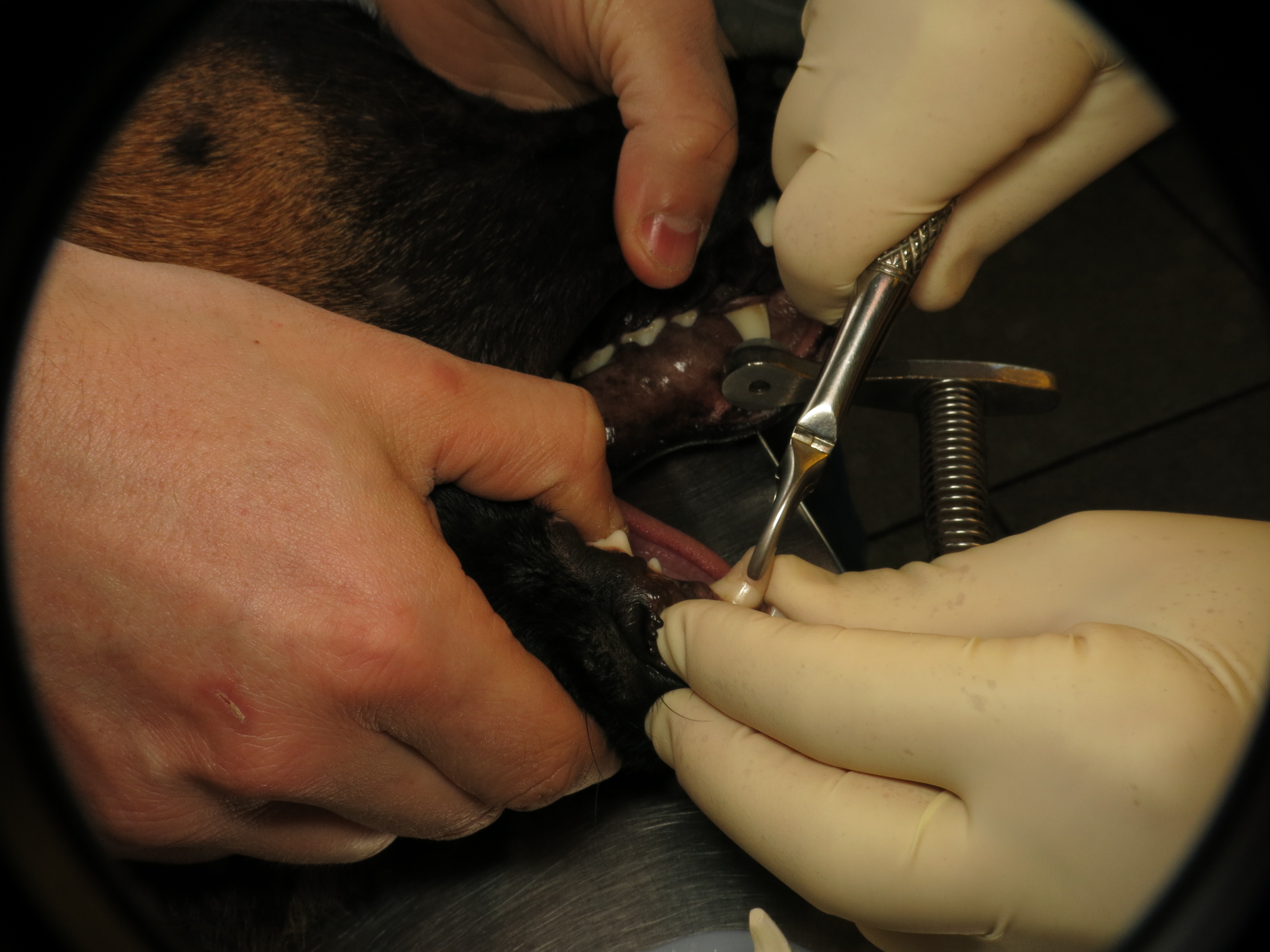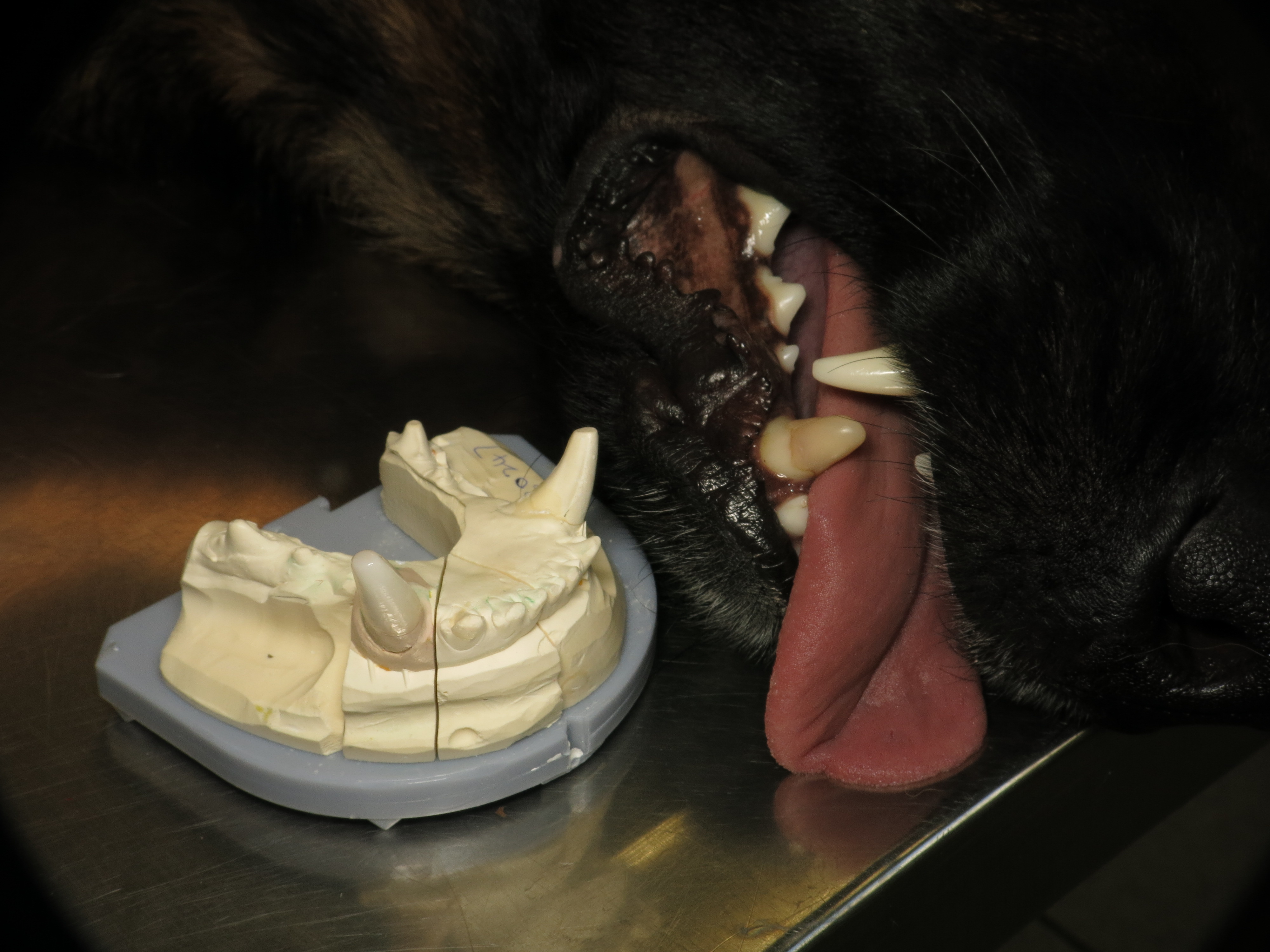 Dépose de la provisoire, à noter que celle-ci a « tenu » 15 jours, alors que le chien a repris son entrainement et ses habitudes de rogner les os et les morceaux de bois !