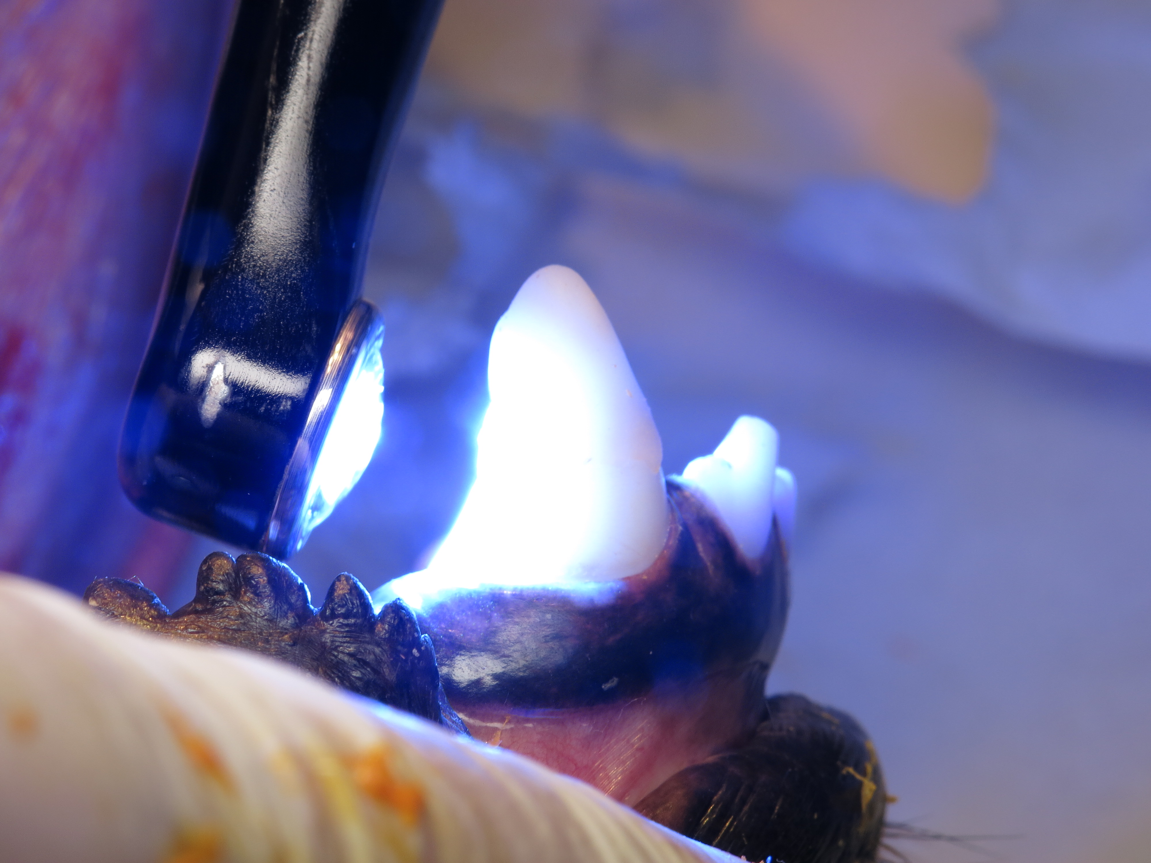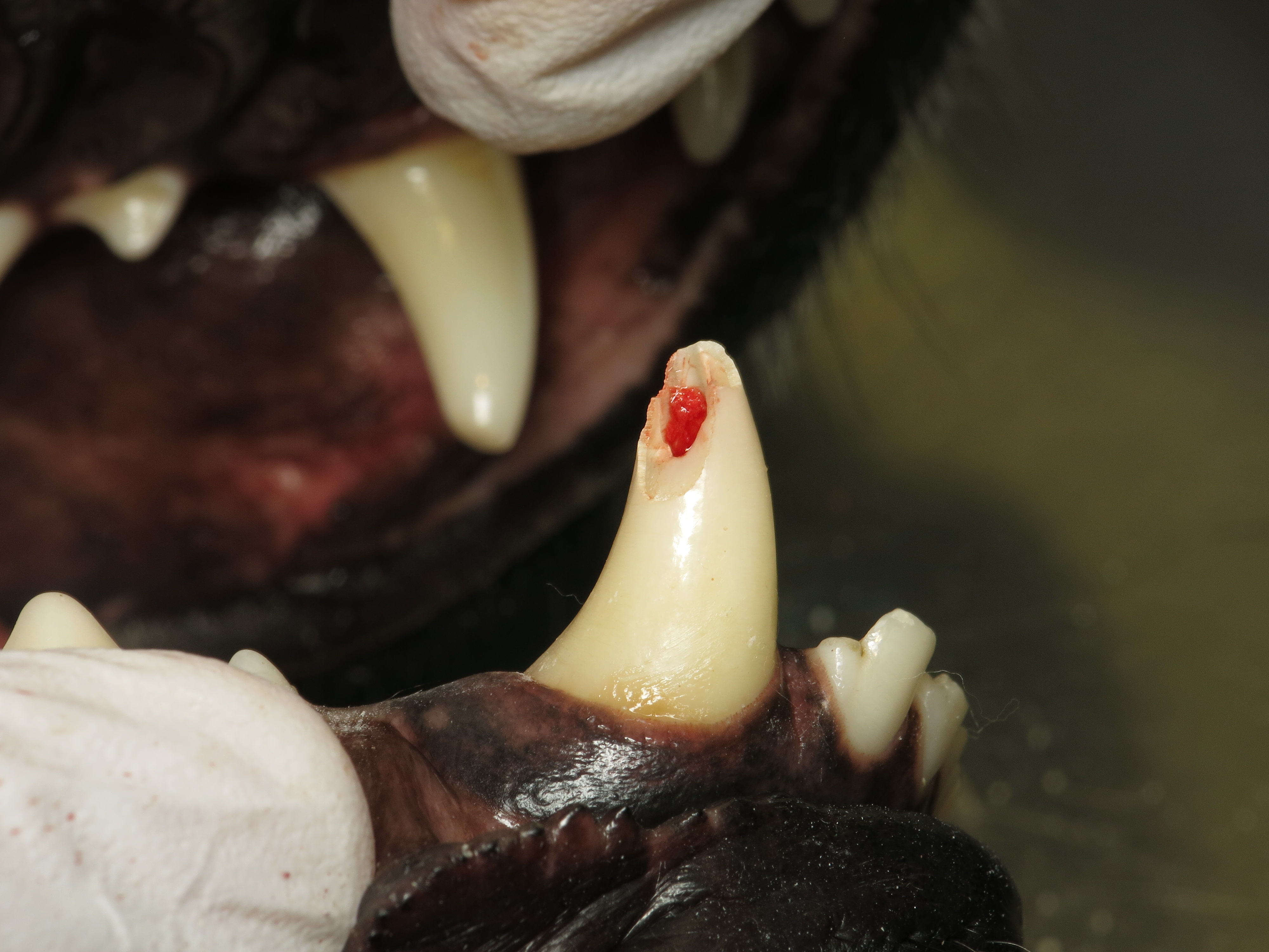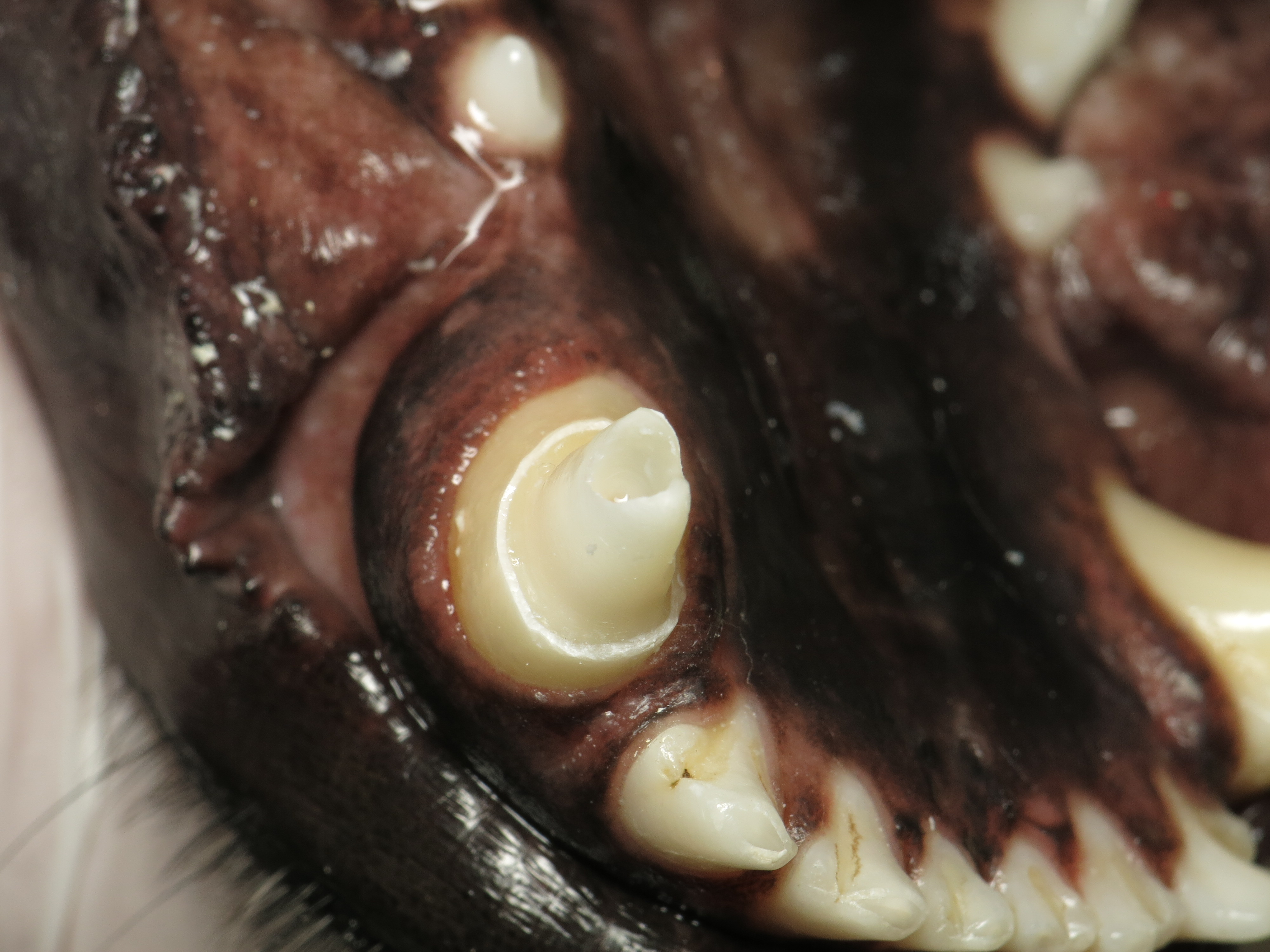 Dépose de la provisoire, à noter que celle-ci a « tenu » 15 jours, alors que le chien a repris son entrainement et ses habitudes de rogner les os et les morceaux de bois !