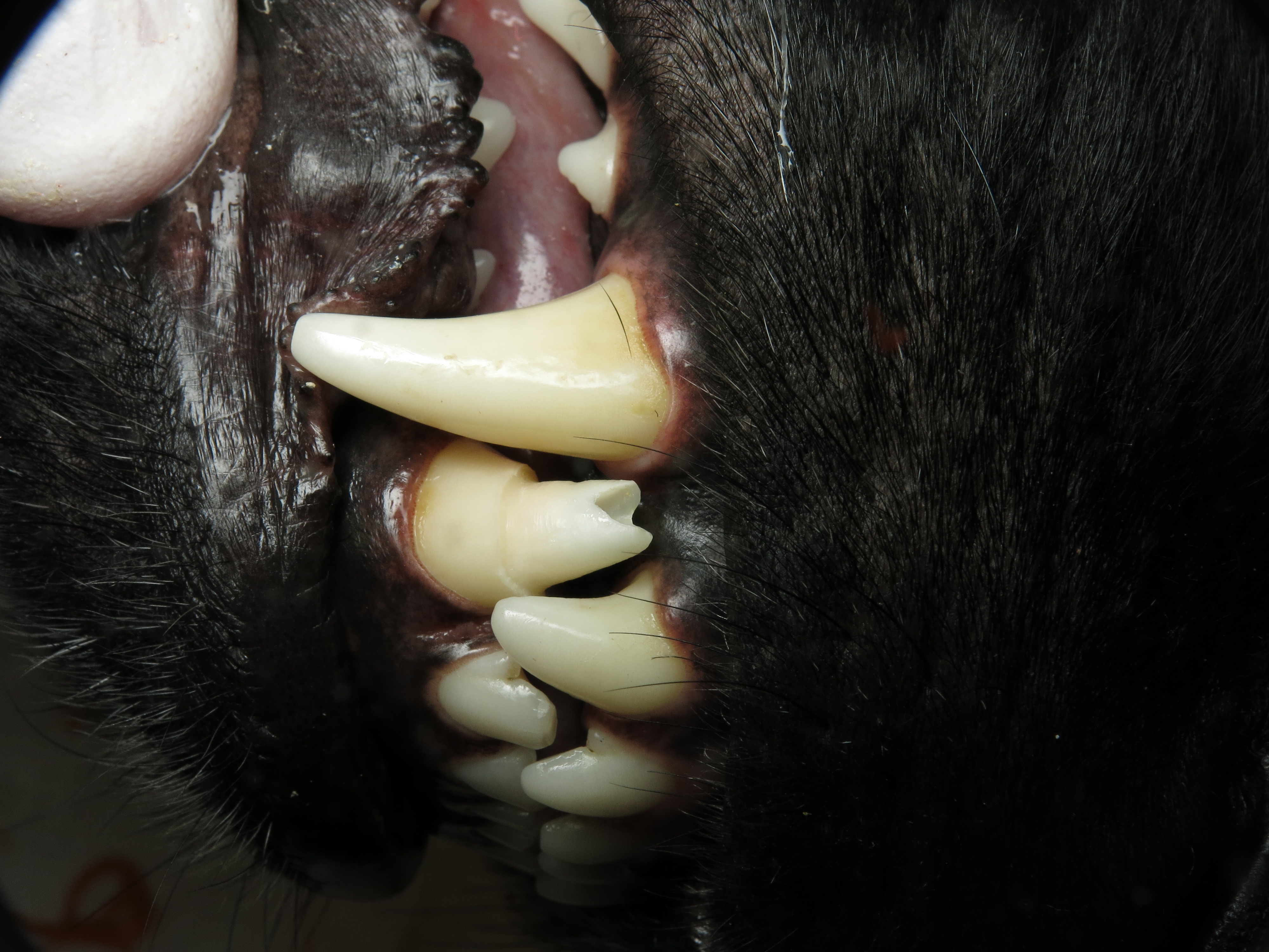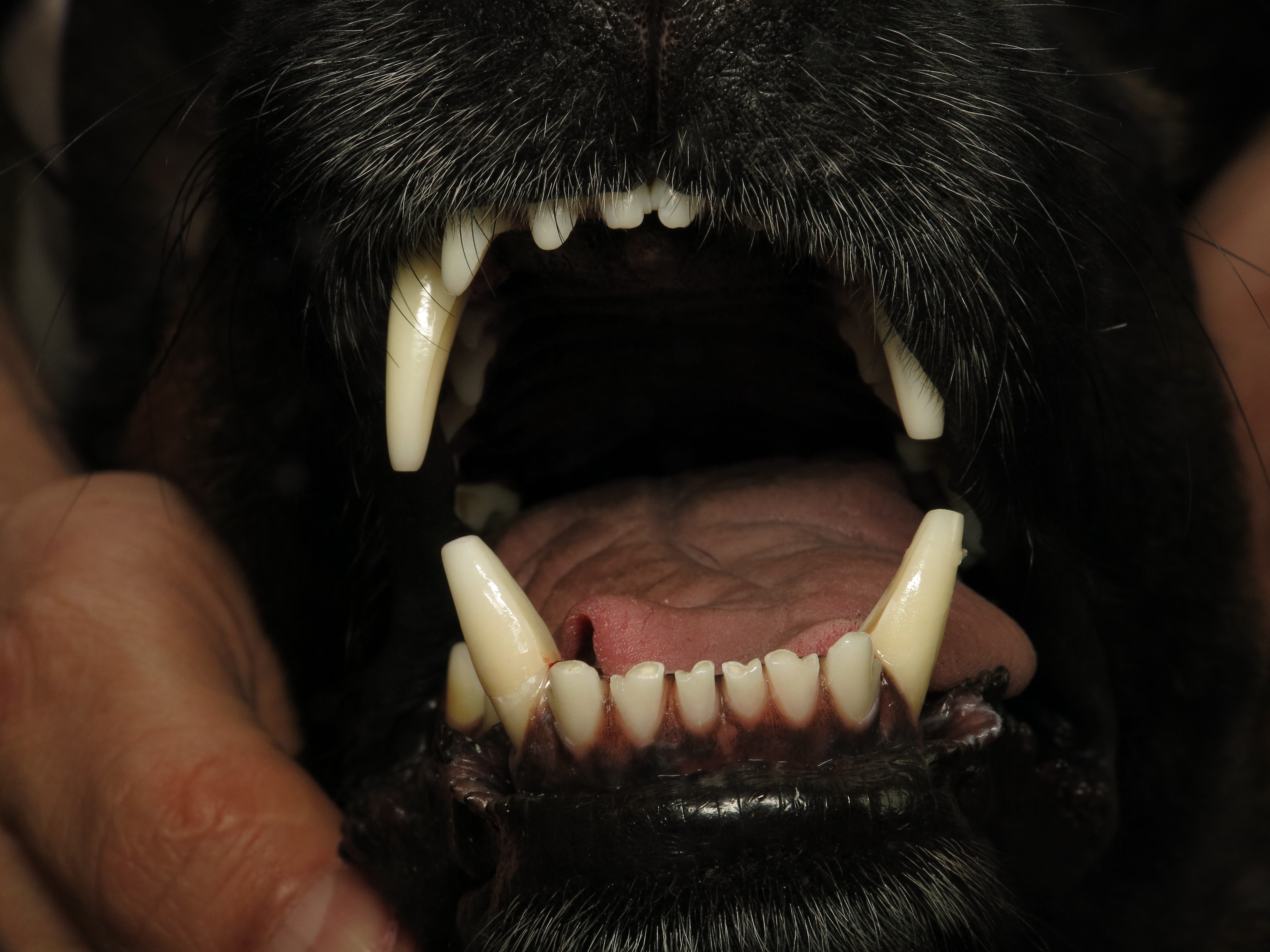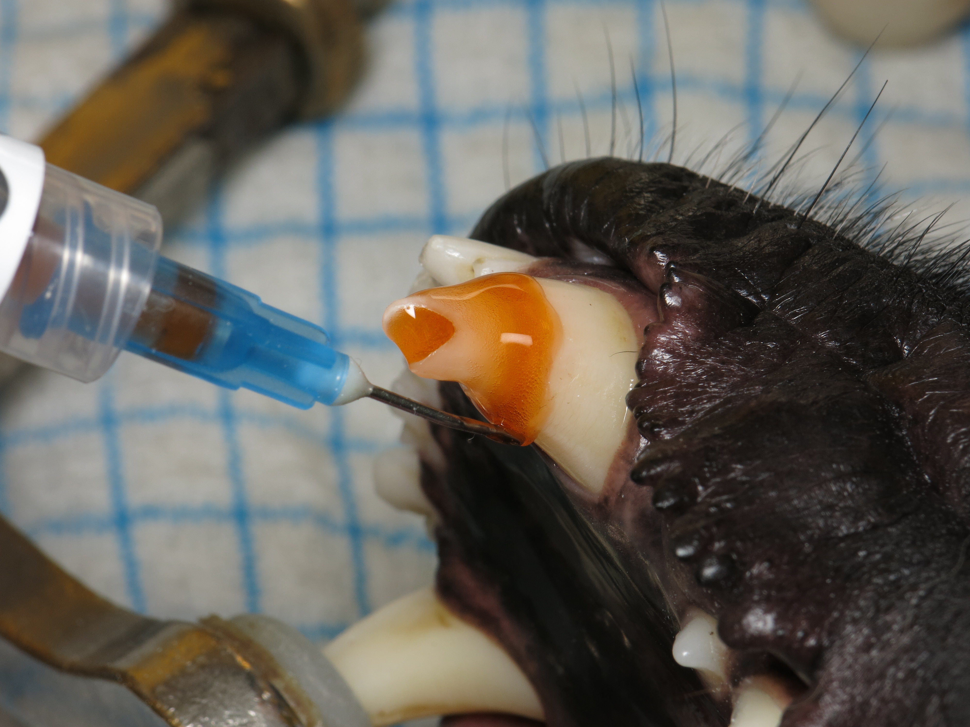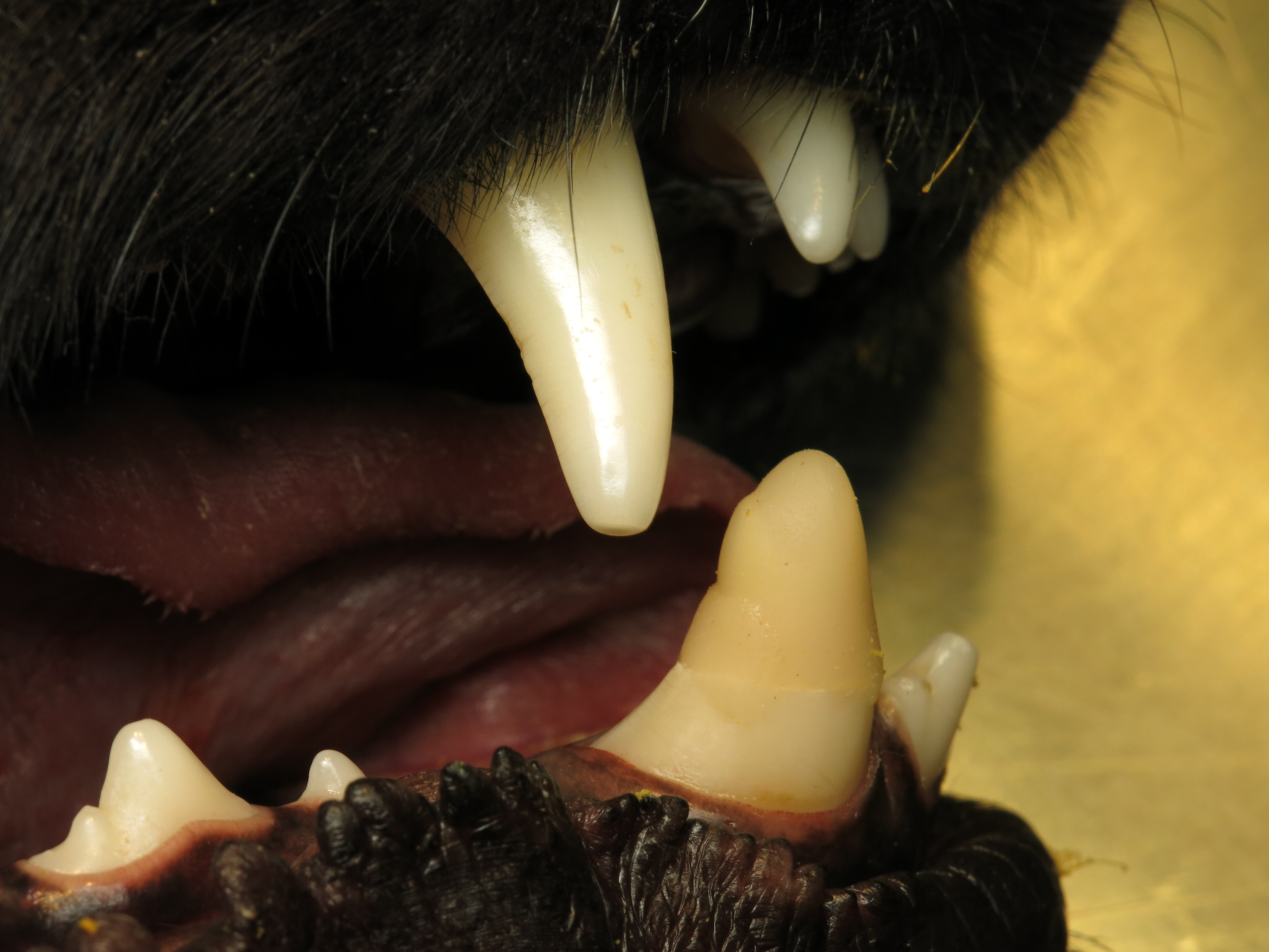 Dépose de la provisoire, à noter que celle-ci a « tenu » 15 jours, alors que le chien a repris son entrainement et ses habitudes de rogner les os et les morceaux de bois !