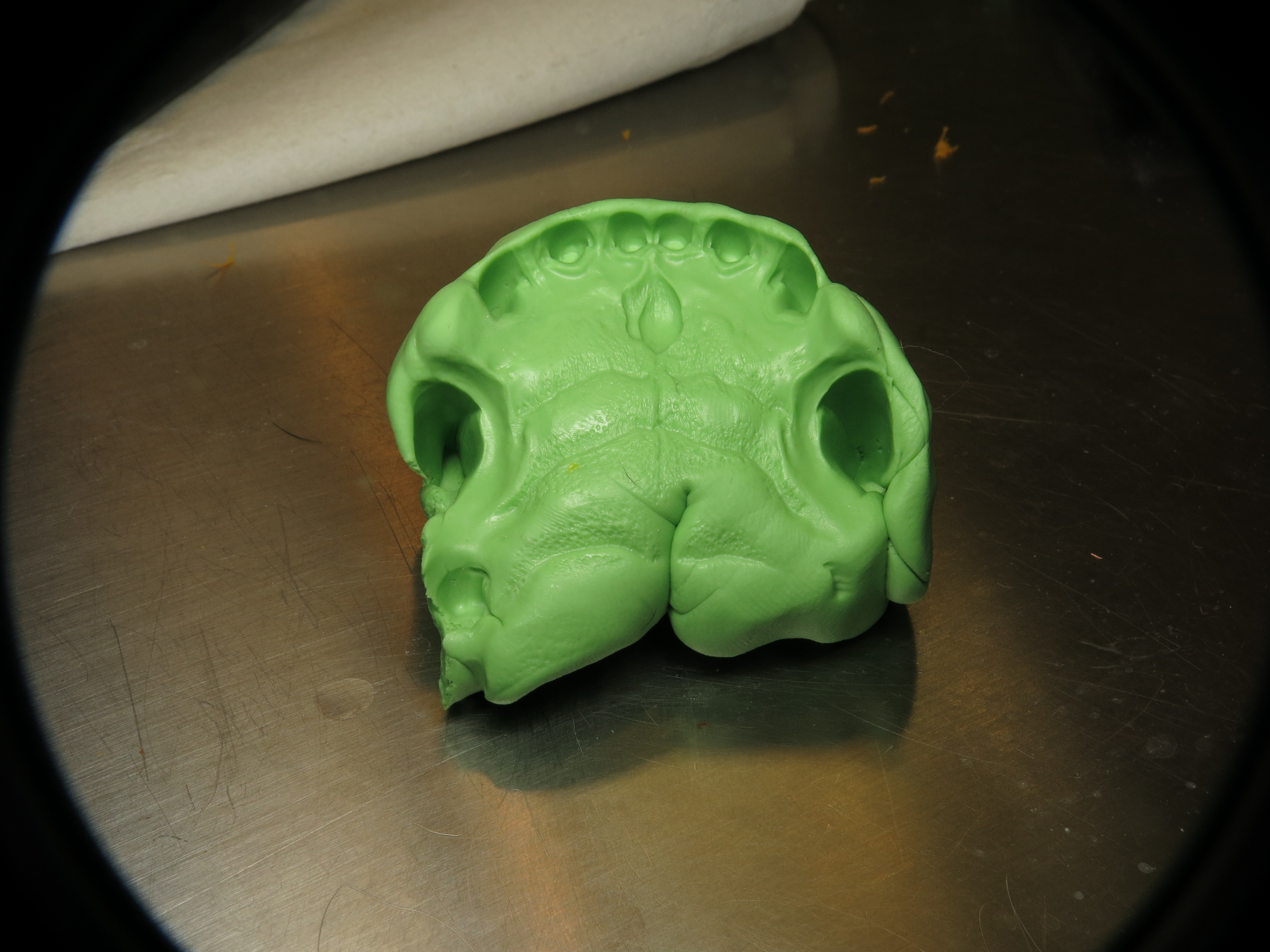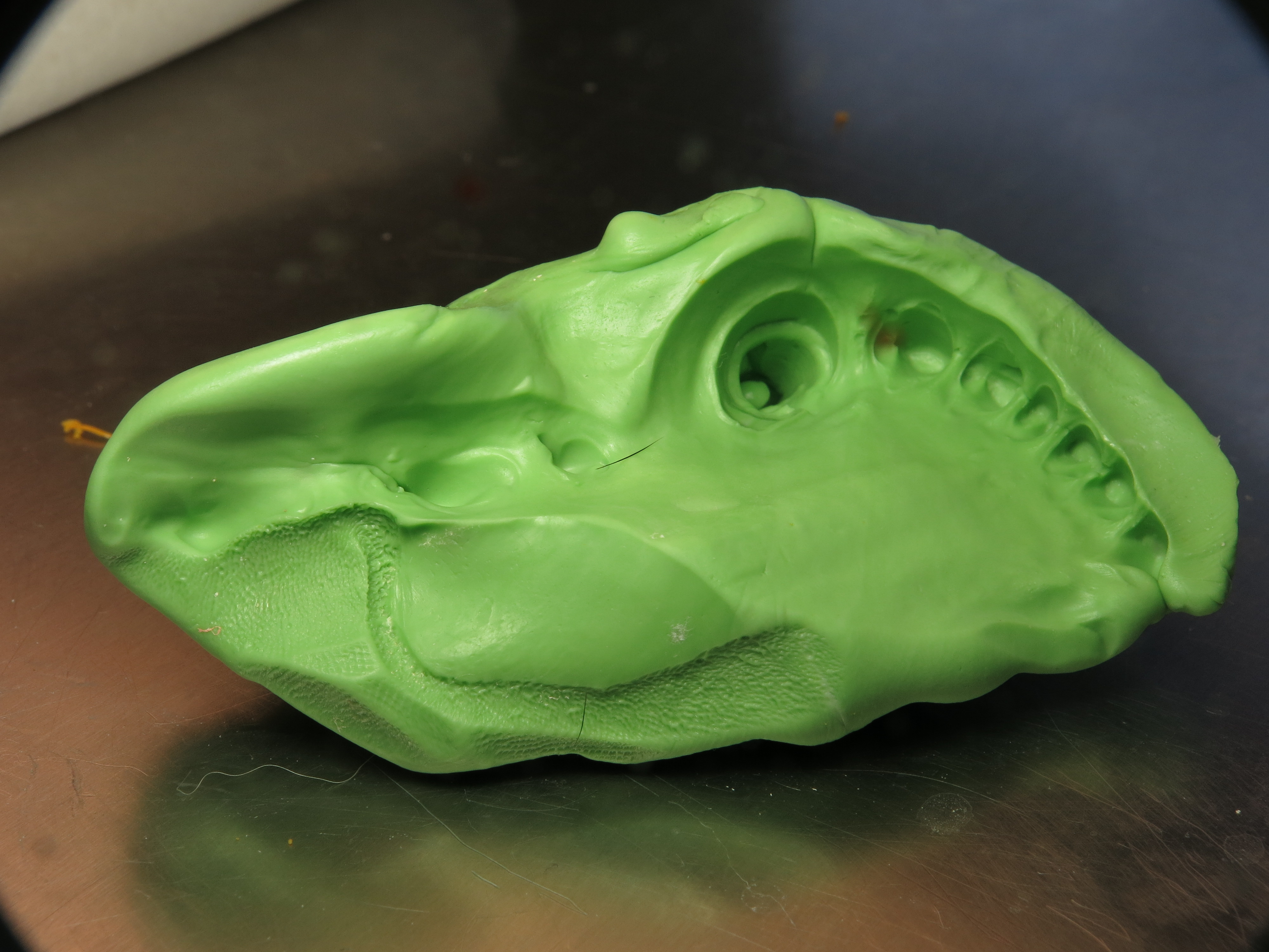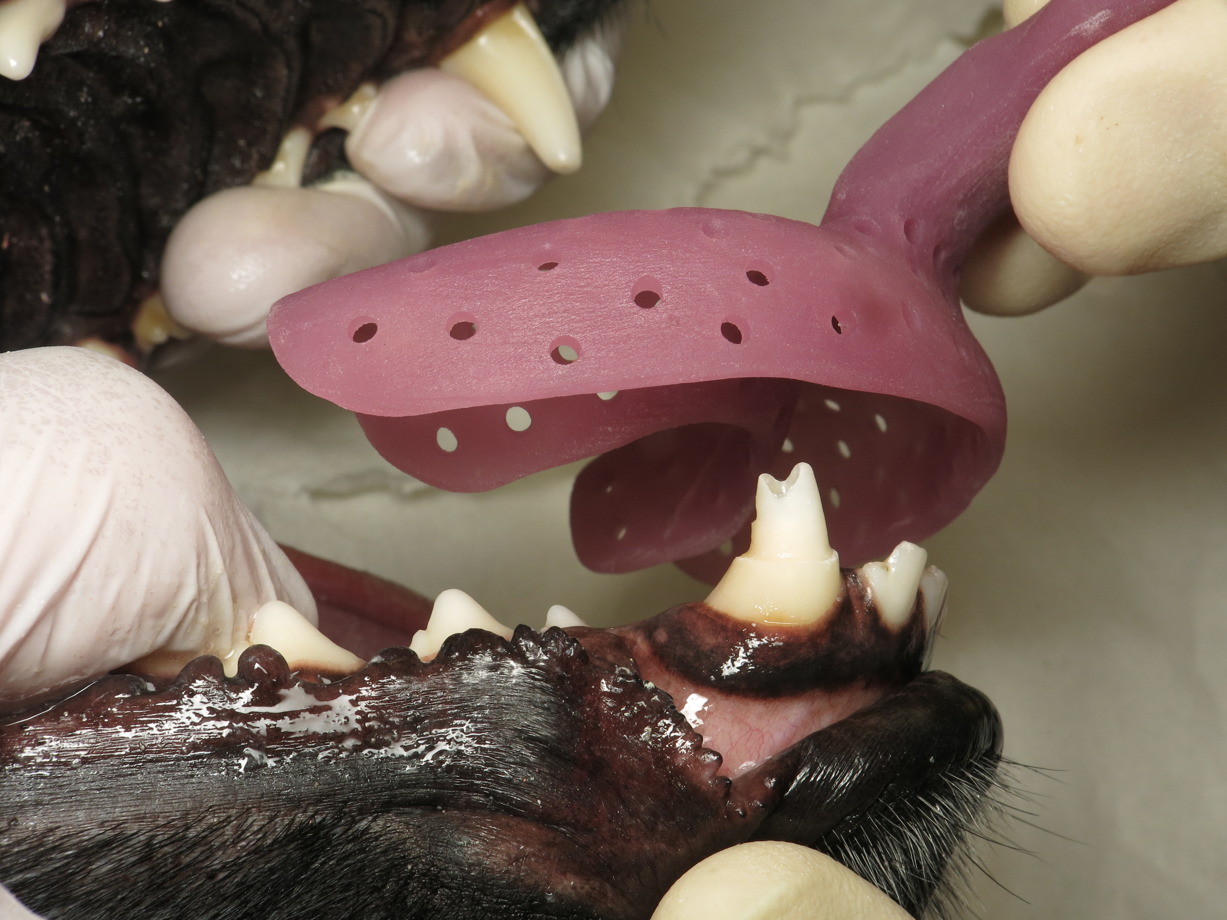 Essayage du Porte Empreinte Individuel « pour chien » réalisé en amont au laboratoire à partir d’un crâne sec de chien