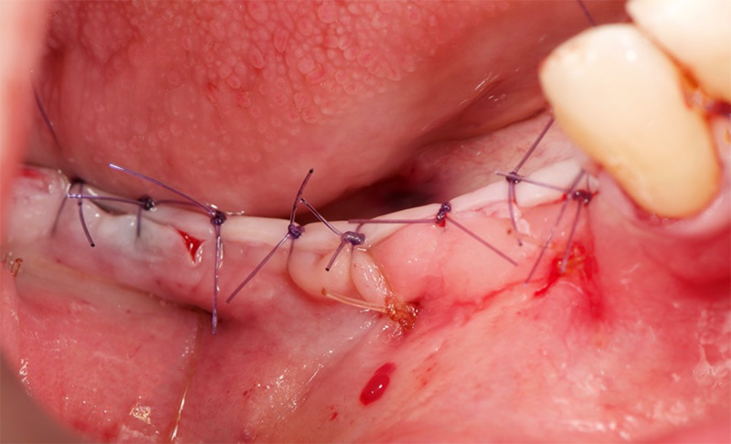 Enfin, comme pour la ROG, il faut réaliser une incision périostée et des sutures afin de fermer le site greffé hermétiquement et sans tension. La réouverture des greffes osseuses autogène se fait autour de 3 à 4 mois en fonction du défaut initial dans le but de permettre le positionnement idéal des implants de façon tridimensionnelle.