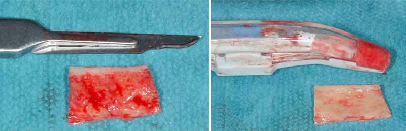 Fig. 06 : l’os particulaire cortico-spongieux est récupéré à la fois au niveau du bloc osseux et au niveau du site donneur ou à distance (os tubérositaire, torus mandibulaire par exemple).