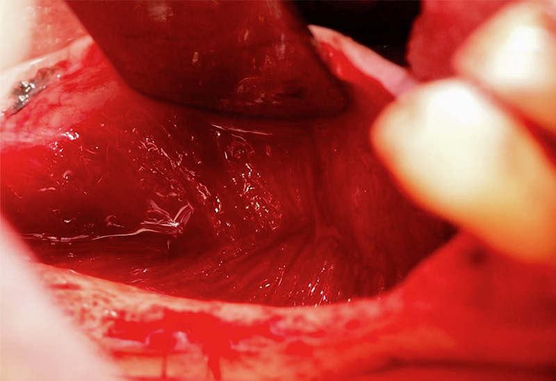 Fig. 01 : le décollement muco-périosté est d’abord vestibulaire et on isolera le trou mentonnier, pour ensuite décoller en lingual ou palatin.