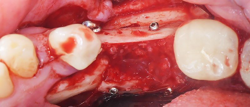 La membrane PTFE est ensuite découpée et fixée pour être parfaitement stable. La fixation commence en mésio-lingual ou palatin puis distale et se fera soit avec des pins ou des microvis. Le comblement est réalisé par le mélange os autogène/xenoparticules au niveau du défaut osseux.