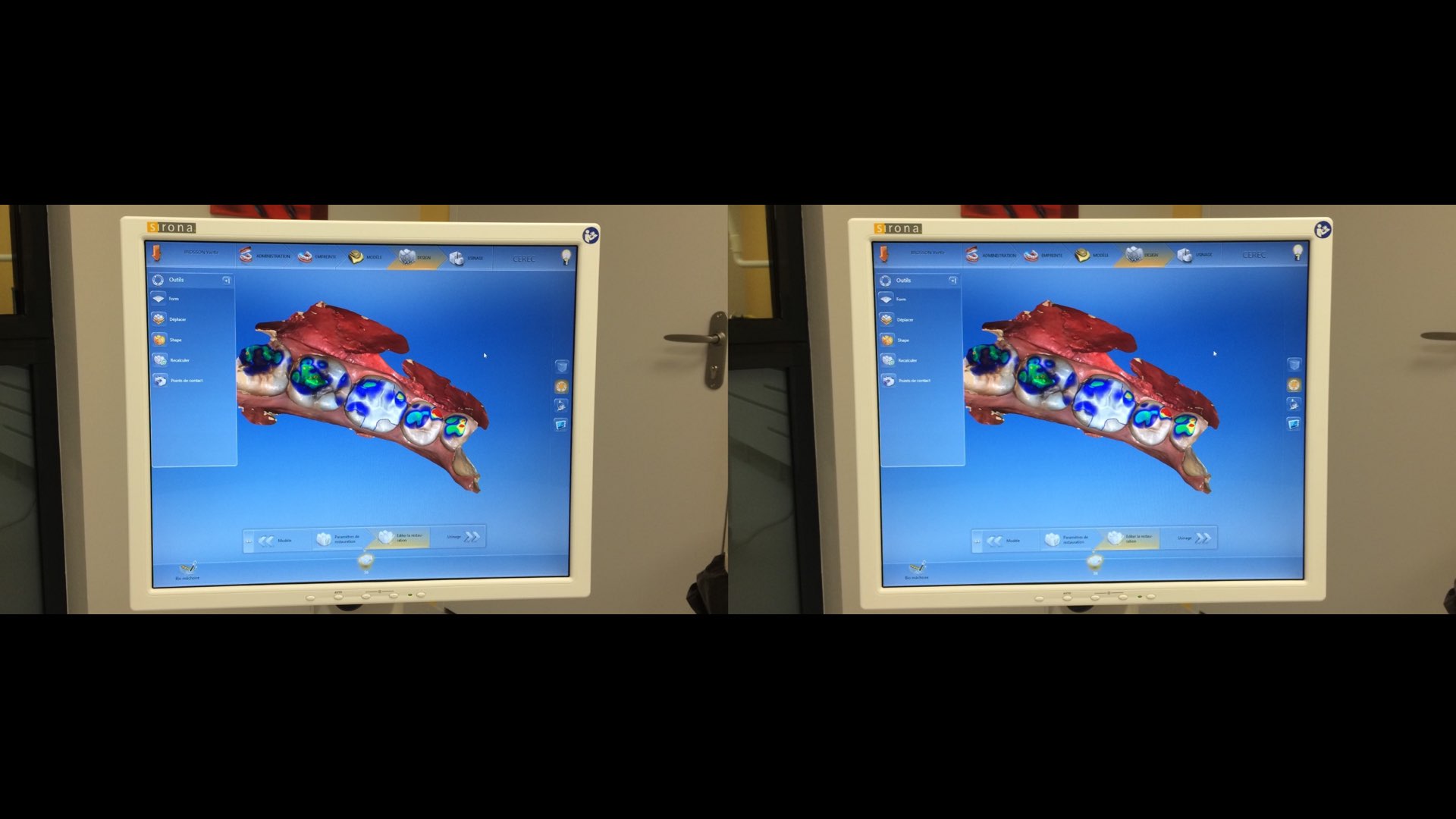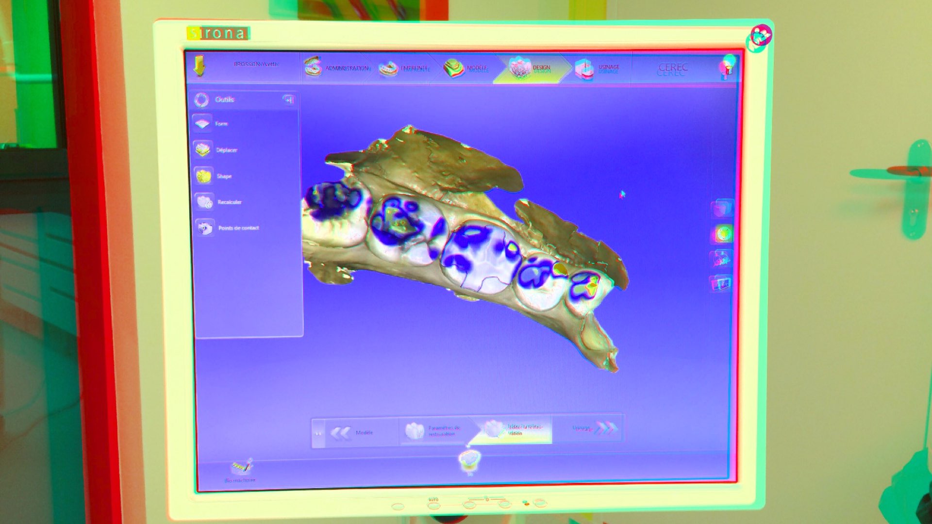 La conception de la restauration devient artistique et raisonnée. Le dentiste devient artiste dentaire, il dessine virtuellement la dent avec ses cuspides et ses sillons, non pas avec un pinceau mais avec une souris (figure 5). Ensuite, l’intégrité fonctionnelle du projet prothétique est contrôlée : épaisseur minimale de matériau, occlusion dynamique et statique sont des paramètres quantifiables avec précision.