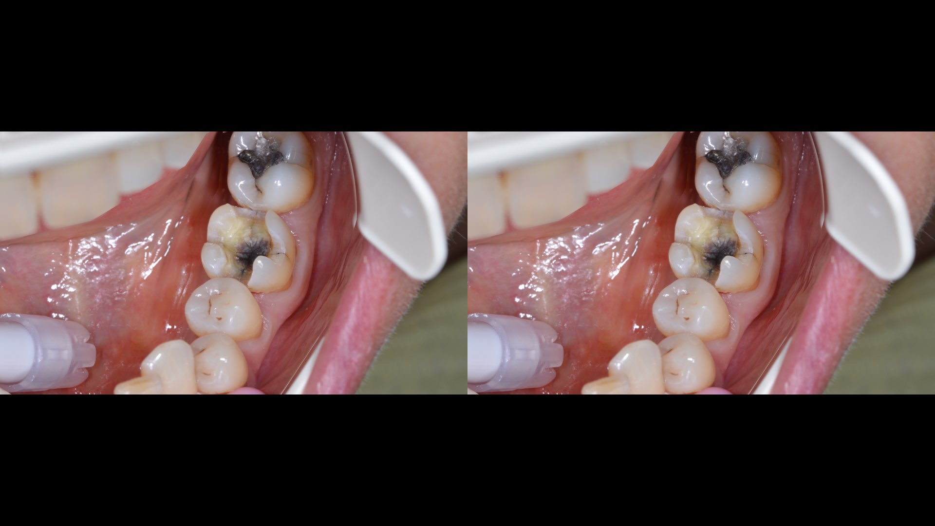 Après dépose de l’amalgame en cause (figure 2), force est de constater que la structure de la dent a été affaiblie : tatouage dentaire, fêlures et perte de substance pour ne citer que les plus fréquentes. Heureusement pour le patient, le praticien va rétablir la fonction et l’esthétique en quelques clics.