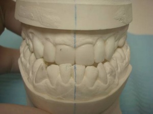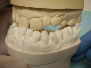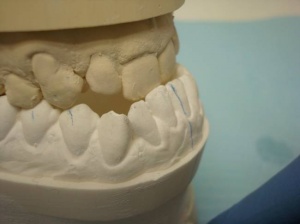 Nous proposons à notre patiente de prendre des empreintes et de faire appel au talent de notre prothésiste Claude Valtin (Paris) pour réaliser une étude prélable (wax up) en vue de réaliser des facettes et des couronnes tout céramique.
