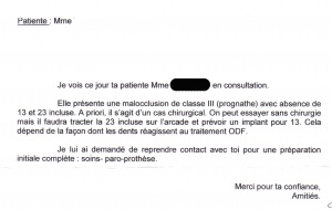 Nous expliquons à la patiente la complexité de son traitement, et tout naturellement nous lui proposons de consulter un orthodontiste spécialisé dans les traitements adultes. Nous lui donnons l’adresse de deux confrères.