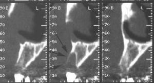 On se propose ici de poser un implant. L’examen du scanner montre qu’une greffe osseuse sera nécessaire.