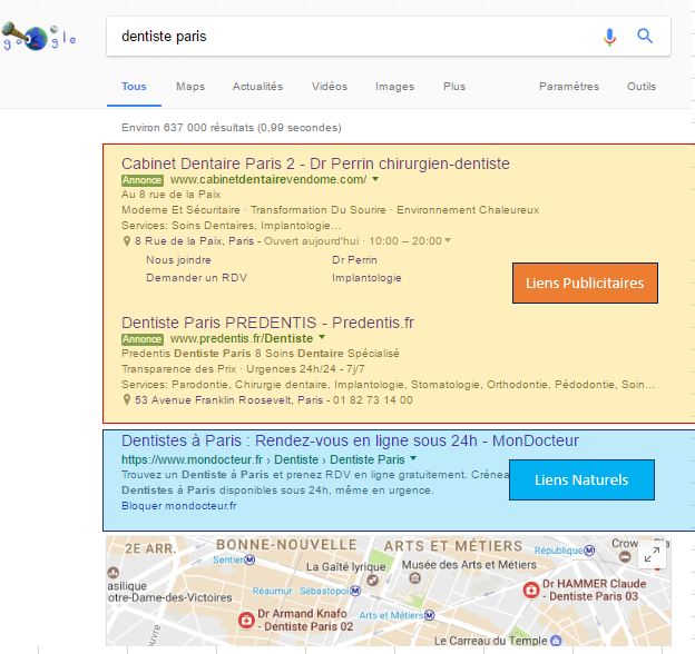 De plus, il est important de différencier les liens payants (publicité) des liens dits naturels, comme le met en évidence la capture d’écran suivante :