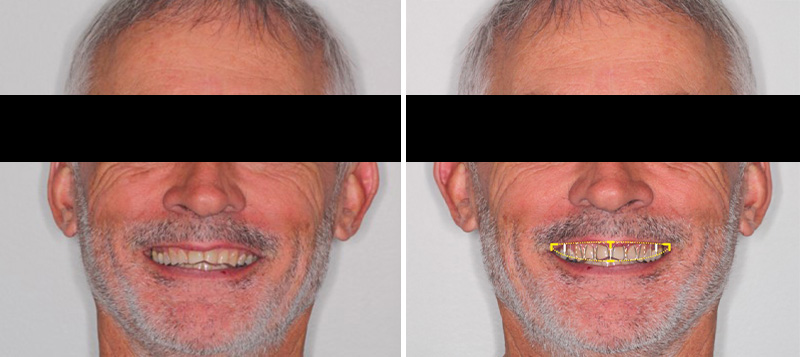 Fig. 01 : situation initiale et étude du futur sourire à l’aide d’un Smile Design (ratio largeur/longueur de l’incisive centrale égale à 80%).