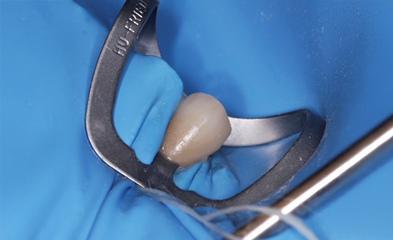 La dent a ensuite été préparée par sablage avec de l’oxyde d’alumine à 50 microns, mordançage de l’émail à l’acide orthophosphorique pendant 30 secondes, application d’un adhésif universel et polymérisation.