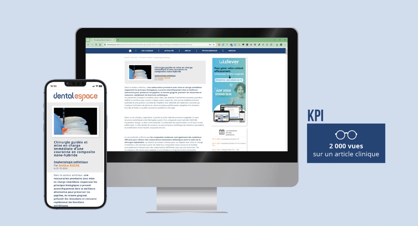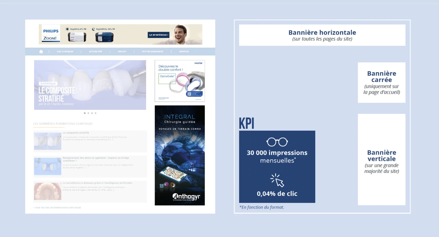 Augmentez la visibilité de votre marque, de votre événement ou de votre offre sur Dentalespace grâce à nos formats de bannières (mégabannière, grand-angle et pavé). Cet affichage complète parfaitement une campagne de communication digitale à 360°.