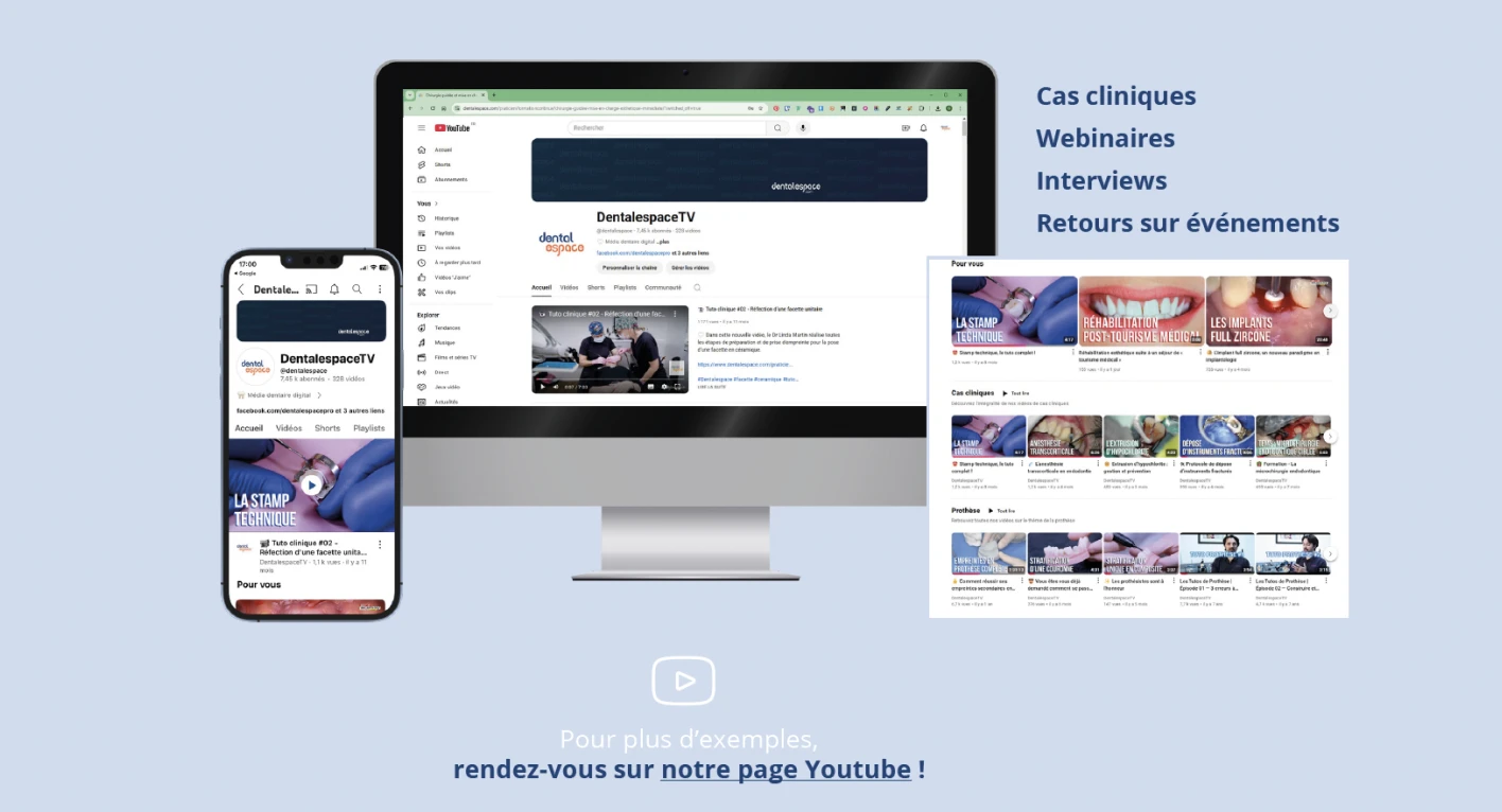 Dentalespace est très présent sur les réseaux sociaux. Retrouvez-nous sur Facebook, Instagram, LinkedIn et YouTube, où nous partageons du contenu clinique avec notre communauté de professionnels du dentaire. Ainsi vous profiterez de notre audience engagée pour diffuser vos communications et annoncer vos événements.